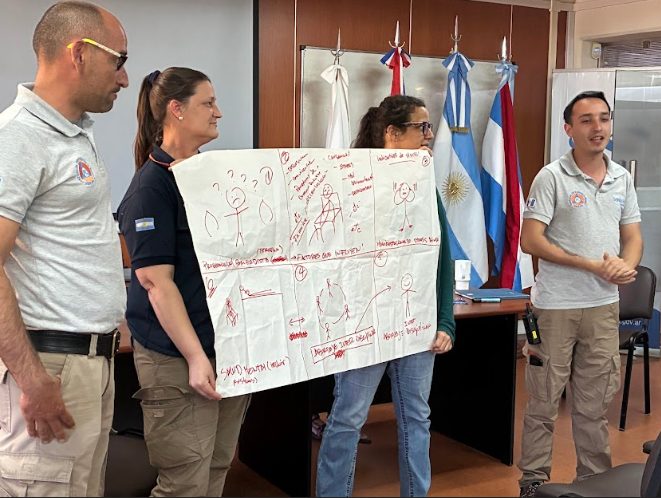 El SH de Argentina contó con un comité organizador formado por Aylen Carrasco, Virginia Venturini y Zuleica Marchetti, de la Facultad de Ingeniería y Ciencias Hídricas (Universidad Nacional del Litoral, UNL); Brián Ferrero y Adriana Millán, del Centro de Investigación y Transferencia Rafaela (CONICET-Universidad Nacional de Rafaela, UNRaf); Francisco Díaz, de la Secretaría de Protección Civil y Gestión de Riesgos de la Provincia de Santa Fe; y Jay Mistry y Bibiana Bilbao, de COBRA Collective CIC. Asistieron 44 participantes de Francia, Italia, España, Bolivia, Reino Unido y Argentina, provenientes de las diferentes entidades socias del proyecto.